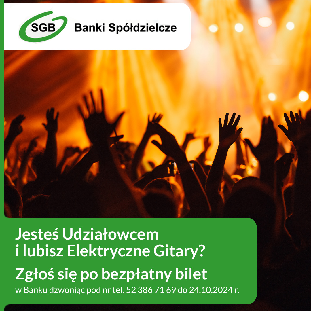 Szanowni Udziałowcy naszego Banku – mamy dla Was bilety na koncert zespołu Elektryczne Gitary. Koncert odbędzie się 14.02.2025 roku w hali Łuczniczka w Bydgoszczy. Jesteś Udziałowcem, lubisz Elektryczne Gitary – zarezerwuj w Banku bezpłatny bilet dzwoniąc pod nr tel. 52 386 71 69 do 24.10.2024 r. Ilość biletów jest ograniczona, decyduje kolejność zgłoszeń. Serdecznie zapraszamy.