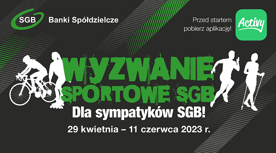 Już za chwilę wystartuje 2 edycja Wyzwania Sportowego dla Sympatyków SGB. Nie może Ciebie w nim zabraknąć! Od 29 kwietnia do 11 czerwca będziemy chodzić, biegać, jeździć na rowerze i na rolkach (nowość!), żeby zbierać kilometry w szczytnym celu. O tym, do kogo powędrują pieniądze z wygranej zadecydują najlepsze banki.